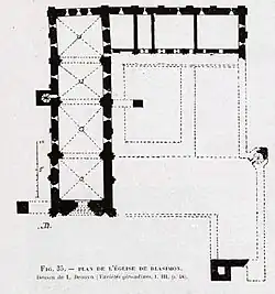 - Grundriss der Kirche und Wirtschaftsgebäude (Osten oben)