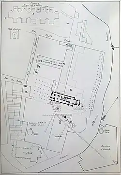 Über die Baugeschichte der Klostergebäude vor dem 18. Jahrhundert ist fast nichts bekannt. Im Jahr 1524 wurde ein Jupiter-Heiligtum auf Initiative von Abbé Pierre Lanisson, dessen Grabstein in der Kirche Notre-Dame-en-Vaux erhalten ist, rekonstruiert. Im Jahr 1713 begannen die Bistumsverantwortlichen einen aufwendigen Neubau der Klostergebäude und der Kirche. Ein erster Flügel wurde 1718 vollendet, ein zweiter Flügel 1758 begonnen. Die Kirche wurde im Jahre 1772 abgerissen, aber wegen der Revolution und der Auflösung des Klosters nie wieder aufgebaut. Die verbliebenen Gebäude wurden innerhalb einer Infanteriekaserne und Kavalleriekaserne wieder verwendet und schließlich im Jahre 1836 völlig niedergelegt.[1]