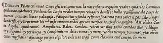 - ↑ Freie Übersetzung des Mitte des 16. Jahrhunderts in kastilischer Sprache verfassten Textes Alonso de Chaves: Quatri partitu en cosmographia pratica i por otro no[m]bre llamado Espeio de Navegantes. Biblioteca Digital de la Real Academia de Historia, 1537, S. 63, abgerufen am 25. Juli 2023 (spanisch).