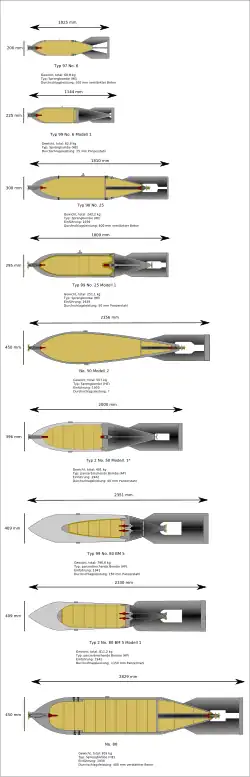 | No. 6 Modell 2 | Standard | 60 kg | 28,2 kg | Pikrinsäure | 1.080 mm | 229 mm | A-1(a),A-3(a) | tropfenförmig Produktion zwischen 1940 und 1941 beendet, aber weiter benutzt[4][5] |