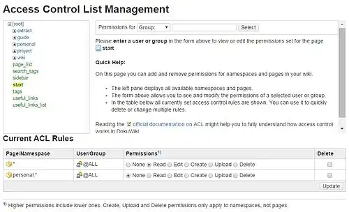 - Bei einer Reihe von Webanwendungen werden ACLs benutzt, um den Zugriff auf einzelne Seiten oder Bereiche auf bestimmte Benutzer oder Benutzergruppen einzuschränken, so bei einigen Wikis (etwa DokuWiki) und CMS (etwa eZ Publish).