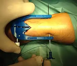 Ist die Sehne nahe am Fersenbein gerissen, was selten ist, muss sie direkt am Fersenbein refixiert werden. Hierzu können Knochenanker-Nähte verwendet werden. Beim ebenfalls seltenen knöchernen Ausriss der Sehne direkt aus dem Fersenbein wird das Knochenstück zusammen mit der anhängenden Sehne mittels einer Osteosynthese mit Schrauben wieder am Fersenbeinhöcker fixiert.