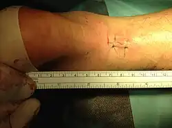 Anders als bei der offenen Operation wird die gerissene Sehne nicht freigelegt, sondern die Sehnenenden werden über kleine Hautschnitte aufgesucht und wieder miteinander verbunden. Ein kleiner, quer verlaufender Hautschnitt auf Höhe der Rissstelle ermöglicht es, die Annäherung der gerissenen Sehnenenden zu kontrollieren. Eine Läsion des Nervus suralis mit entsprechendem Ausfall der Hautsensibilität im Fußbereich tritt häufig auf, da der Nerv außenseitig dort verläuft, wo mehrere kleine Stichinzisionen für die Naht erfolgen. Jedoch treten deutlich seltener Wundheilungsstörungen auf.