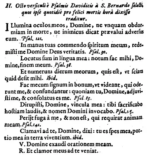 Im 15. Jahrhundert wurden in Stundenbüchern nach den Psalmen oft Reihen von zusätzlichen Gebeten angeführt. Die Bernhard zugeschriebene Auswahl von Psalmworten wurde mit einer humorvollen Legende begründet, die manchmal in Gebetbüchern einleitend wiedergegeben ist. Der Teufel soll Bernhard gesagt haben, dass er die acht (manchmal sieben) Verse in den Psalmen kenne, die die Errettung eines jeden Menschen garantieren würden, wenn man sie täglich rezitiere. Der Teufel verriet natürlich nicht, welche Bibelstellen gemeint waren. Bernhard erwiderte, dass er die Verse sicher aufsagen könne, indem er täglich den ganzen Psalter rezitiere. Daraufhin gab der Teufel nach und sagte dem Zisterzienserabt, welche Verse das Heil wirken. Diese acht Verse wurden in viele Gebetbücher aufgenommen und gelangten zu europaweiter Bekanntheit.