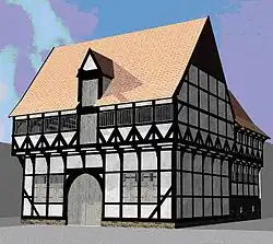 Vermuteter baulicher Zustand von Vorderhaus und Anbau Langedammstraße um 1432[8] (Rekonstruktionsversuch auf Grundlage der bauhistorischen Untersuchungsergebnisse von 2004).[9]
