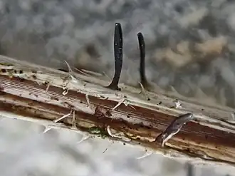 Acrospermum compressum auf einem toten Brennnesselstängel | ||||||||||||