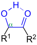 | Strukturformel von Acyloinen mit der charakteristischen α-Hydroxyketogruppe (blau markiert). Die Reste R1 und R2 sind Organyl-Reste (Alkyl-Reste, Aryl-Reste, Aklylaryl-Reste etc.); gestrichelt gezeichnet ist die Wasserstoffbrückenbindung zwischen dem Carbonyl-Sauerstoffatom und dem Wasserstoffatom der Hydroxygruppe. |