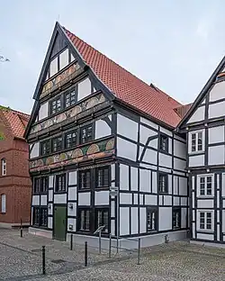 Das dreigeschossige Fachwerkgiebelhaus, das um 1560 erbaut wurde, zeichnet sich vor allem durch seine reichen Schnitzereien an den Friesen der Giebelfront aus. Der eindrucksvollste der drei mit ornamentalem und figürlichem Schmuck versehenen Schnitzfriese ist der untere, der dem Haus auch seinen Namen gab. In klassischer Leserichtung erzählt er von links nach rechts die Geschichte vom Sündenfall Adam und Evas, die mit ihrer Vertreibung aus dem Paradies endete. Diese Schnitzerei ist zur Entstehungszeit beispielhaft für die Architektur der Weserrenaissance und die Geschichte der Reformation.