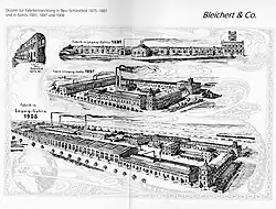 Nachdem eine 1874 von Adolf Bleichert gegründete Seilbahnfabrik durch den Wechsel seines Gesellschafters Theodor Otto zu Julius Pohlig in Siegen beendet wurde, gründete Adolf Bleichert 1876 zusammen mit seinem Schwager, dem Kaufmann Peter Heinrich Piel, die Adolf Bleichert & Co.[1][2] in Leipzig-Neuschönefeld,[3] die sich bald einen Ruf als Hersteller und Erbauer von Drahtseilbahnen erwarb.[4] 1881 wurde der Betrieb nach Leipzig-Gohlis verlegt,[5] von wo er mit zunächst 20 technischen und kaufmännischen Angestellten („Beamten“) und 70 Arbeitern Seilbahnen in alle Welt lieferte.[6] Vor allem die Rohstoff- und Schwerindustrie zeigte großes Interesse an den neuen Anlagen.[7]