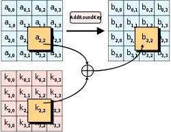 Vor der ersten und nach jeder Verschlüsselungsrunde wird der Datenblock mit einem der Rundenschlüssel XOR-verknüpft. Dies ist die einzige Funktion in AES, in die der Benutzerschlüssel eingeht.