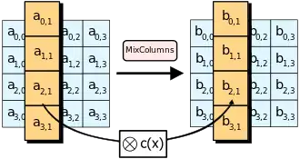 Als dritte Operation jeder Runde außer der Schlussrunde werden die Daten innerhalb der Spalten vermischt. Zur Berechnung eines Bytes der neuen Spalte wird jedes Byte der alten mit einer Konstanten (1, 2 oder 3) multipliziert. Dies geschieht modulo des irreduziblen Polynoms im Galois-Körper . Dann werden die Ergebnisse XOR-verknüpft: