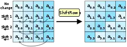 Wie oben erwähnt, liegt ein Block in Form einer zweidimensionalen Tabelle mit vier Zeilen vor. In diesem zweiten Schritt jeder Runde werden die Zeilen um eine bestimmte Anzahl von Spalten nach links verschoben. Überlaufende Zellen werden von rechts fortgesetzt. Die Anzahl der Verschiebungen ist zeilen- und blocklängenabhängig: