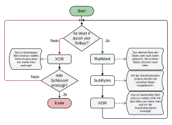 Sei die Länge des Benutzerschlüssels in Wörtern. Dieser wird zunächst in die ersten Wörter des Arrays eingetragen. Dann werden in einer Iteration die weiteren Wörter jeweils durch bitweises XOR von und berechnet. Für jedes -te Wort wird zuvor rotiert, byteweise substituiert und mit einer von abhängigen Konstanten verknüpft. Falls ist, wird dazwischen alle Wörter noch eine weitere Substitution ausgeführt.
