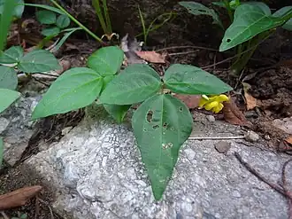 Die ersten Blätter des Sämlings sind gegenständig, lang gestielt, einfach und herzförmig.[3][4] Die wechselständig am Stängel angeordneten, einfachen Laubblätter sind in Blattstiel und Blattspreite gegliedert. Der Blattstiel ist relativ lang[3] und leicht haarig. Die Blattspreite ist dreizählig.[1][3] Die meist ganzrandigen Fiederblättchen sind bei einer Länge von 5 bis 10 Zentimetern sowie einer Breite von 5 bis 8 Zentimetern eiförmig bis rhombisch und meist spitz bis zugespitzt.[2] Die Blättchen sind ungleichseitig, meist einfach oder leicht zwei- bis dreilappig.[2][3] Beide Seiten der Blättchen sind spärlich fein behaart.[2] Die zwei mit etwa 8 Millimetern[2] relativ kleinen Nebenblätter sind schildförmig, oft leicht zweispaltig mit Anhängseln an ihrer Basis, untereinander frei und nicht mit dem Blattstiel verwachsen. Die Nebenblättchen der Fiederblättchen sind lanzettlich.[3] Die Laubblätter sind meist bis zur Fruchtreife haltbar.[4]
