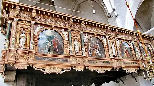 Den Innenausbau dominiert der Singechor oder Lettner des Bildschnitzers Tönnies Evers d. J. (1587). Er geht ebenfalls auf die Stiftung von Lorenz Russe aus seinem Testament zurück und ersetzte einen früheren Lettner.[16] Die Gemälde werden dem Maler Gregor von Gehrden zugeschrieben[17], sie werden begleitet von lateinischen Distichen.[18]