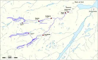 Der River Farrar und der River Glass vereinigen sich zum River Beauly, der bei Aigas und bei Kilmorack durch eine Schlucht fließt, wobei beide Schluchten aufgestaut sind und die Wasserkraft mit einem in die Staumauer integrierten Flusskraftwerk genutzt wird.[4]