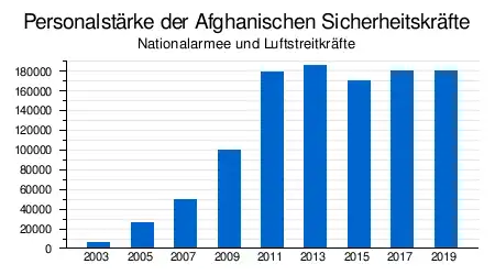 Gegen Ende des Jahres 2009 hatte die ANA eine Stärke von 97.000 Soldaten erreicht.[17] Als Folge dessen wurde das Ziel ausgegeben, die Zahl der Soldaten bis ins Jahr 2015 auf rund 260.000 zu steigern.[18] Im März 2011 betrug die offizielle Truppenstärke etwa 150.000.[19]