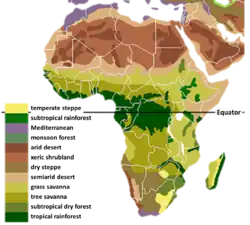 Durch seine Lage beiderseits des Äquators und seine kompakte Form besitzt Afrika die größte zusammenhängende Landmasse der Tropen. 75 % der Fläche Afrikas liegen innerhalb der Wendekreise, die die mathematische Tropengrenze bilden. Ein großer Teil Zentral- und Westafrikas ist von tropischem Regenwald bedeckt; das Kongobecken ist nach Amazonien das zweitgrößte Regenwaldgebiet der Erde. Um die Wendekreise sind große Wüsten entstanden, die sich durch Desertifikation ausbreiten; die Sahara im Norden wird nur durch die Flussoase des Nil unterbrochen, im Süden befinden sich die Namib als Nebelwüste und die Kalahari als Trockensavanne. Südlich der Sahara (Sahelzone) und in Ostafrika bis Südafrika hinunter befinden sich riesige Savannengebiete. Im Bereich zweier jährlicher Niederschlagsmaxima breiten sich die Trockenwälder und Feuerökosysteme aus, beispielsweise Mopane, Miombo oder Chipya-Vegetation. Südostafrika ist durch den Einfluss des Monsuns und die großen Täler von Sambesi und Limpopo fruchtbarer.