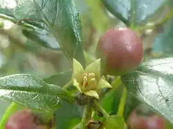 Bis zu zehn Blüten stehen meist in kleinen Büscheln, seltener einzeln, in den Blattachseln zusammen. Die kleinen, unscheinbaren und gestielten, zwittrigen Blüten sind fünfzählig mit einfacher oder doppelter Blütenhülle, die kleinen Kronblätter fehlen meist.[2] Die kurz becherförmig verwachsenen, außen etwas behaarten Kelchblätter sind grünlich-gelb mit spitzen, dreieckigen Zipfeln. Es sind kurze Staubblätter und ein oberständiger, mehrkammeriger Stempel mit drei kurzen, im unteren Teil verwachsenen Griffeln ausgebildet. Es ist ein dünner Diskus vorhanden.