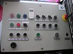Fahrpult des Afterburner „FREE-STYLE“ (Baujahr 1999) des Münchner Schaustellerbetriebs Johann & Margherete Agtsch (bis 2021; nach massiver Umgestaltung heute als „Mexican Flight“ unter dem Münchener Schausteller Franz-Xaver Kollmann auf der Reise). Dieses Modell kann den Gondelkranz lediglich gegen den Uhrzeigersinn drehen und verfügt über eine manuelle Steuerung. Im Bild ist das durch den Betreiber umgebaute (Potentiometer für die Gondeldrehgeschwindigkeit versetzte) Fahrpult zu sehen.