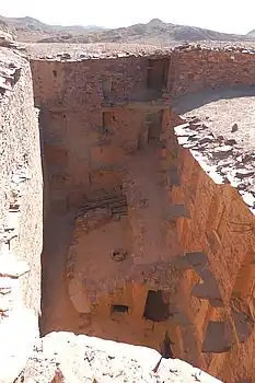 Über eine Eingangspforte gelangt man in einen Vorhof mit einem kleinen Häuschen für den oder die Wärter. Der eigentliche Zugang ins Innere der Speicherburg führt vorbei an den – in vielen Agadiren anzutreffenden – gegenüberliegenden Steinbänken. Ein von Speicherkammern überdeckter Durchgang führt in den hinteren Bereich, wo die einzelnen Kammern in bis zu fünf Stockwerken übereinander angeordnet sind. Insgesamt sind es mehr als 300 ca. 1,50 m bis 1,70 m hohe Speicherkammern, die über aus dem Bruchsteinmauerwerk vorkragende Trittsteine erreichbar sind.