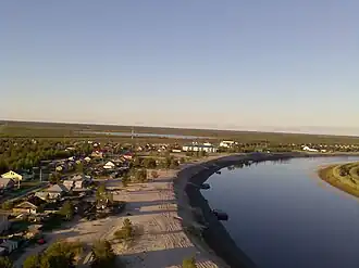 ![]() Blick auf das Dorf Warjogan; rechts der Fluss Agan | ||