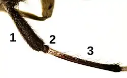 | Abb. 1: Ausschnitt linker Fühler (Teile des Vorderbeins sichtbar) 1,2,3: 1. bis 3. Fühlerglied | |