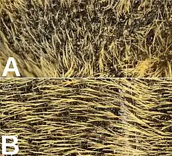 Abb. 3: Behaarung links exakt gleicher Maßstab, oben ca. gleicher Maßstab Kopf liegt links oben: Hinterbein Schenkel (links) und Schiene links A: Seite der Brust links B: Unterseite links unten: Flügeldecken |