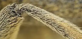 Die Beine sind dicht gelblichgrau behaart (Abb. 3 oben und Abb. 4). Das erste Glied der Hintertarsen (Abb. 4) ist länger als das Krallenglied (charakteristisch für die Untergattung Epoptes). Wie bei fast allen Bockkäfern ist das 4. Tarsenglied rudimentär und in der Aussparung des 3. Tarsenglieds verborgen.[8][7][9][10]