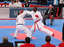- Endposition: Knapp über Stirnhöhe dreht die Handfläche der blockenden Faust nach vorne oben, der Arm ist fast (aber nicht ganz) waagerecht und etwa zwei Handbreit vor der Stirn. In der Endposition sind die Muskeln des Arms angespannt und verleihen ihm Stabilität. Der ausholende Arm bewegt sich in Hikite-Position und die Hüfte dreht sich ein (Hanmi).