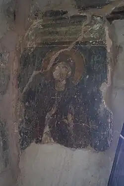 Im Innern sind zwei Schichten der Fresken teilweise erhalten. Die jüngere Wandmalerei wird anhand in die Nordwand eingeritzten Inschriften aus den Jahren 1451 und 1458 in die Mitte des 15. Jahrhunderts datiert. Es gibt auch noch zwei Monogramme mit den Jahreszahlen 1481 und 1486. Am besten sind die Fresken der Agia Polychronia, der Mutter des heiligen Georgs, links neben der Tür und des Erzengel Michael an der Nordwand erhalten. Die moderne Ikonostase stammt aus dem Jahre 1980 und zeigt von links nach rechts den heiligen Georg, die Muttergottes, Jesus Christus und Johannes der Täufer.