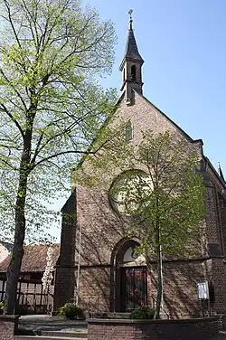 Der Ort, der jahrhundertelang zur Pfarrei Lechenich gehört hatte, erhielt auf vielfachen Wunsch der Bevölkerung 1891 eine eigene Kirche, die nach Plänen des Kölner Dombaumeisters Franz Schmitz als einschiffige Kirche im neugotischen Stil erbaut wurde.[33] Die Einnahmen, die aus den Pachterträgen der „Ahremer Heide“ herrührten, verwendeten die Ahremer dann zum Bau einer eigenen Kirche.[32] Im Jahr 1886 hatten zwei Familien Ahrems der Kirche ein Baugrundstück geschenkt, welches jedoch unmittelbar an der Hauptstraße gelegen war. Bedingt durch diese Lage und wegen der geringen Breite des Grundstücks, entschloss man sich die Kirche nicht geostet zu errichten.