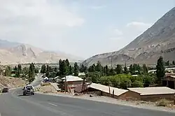 Die aus Duschanbe kommende Schnellstraße überquert den Serafschan einige 100 Meter oberhalb der Einmündung des Fandarja. Der Ort nördlich der Brücke, Sangistan, besteht aus einigen Wohnblocks und zerfallenen Industriebauten, die sich entlang der nach Osten im Tal abgehenden Straße reihen. Von der Einmündung dieser Straße sind es etwa 1,5 Kilometer nach Westen bis zur etwas höher gelegenen, kompakten Siedlung Ainij am nördlichen (rechten) Ufer des Serafschan. Die Wohnhäuser reichen bis an die steil zum Fluss abfallende Böschung. Die M34 führt durch den Ort und an dessen Nordende erneut über eine Brücke an das linke Flussufer. Die Abzweigung nach Pandschikent befindet sich gut zwei Kilometer nordwestlich der Brücke und einen Kilometer vor dem Dorf Chuschikat, wo die M34 erneut auf die nördliche Flussseite wechselt und der Anstieg zum Schahriston-Tunnel beginnt. Vor Chuschikat verläuft parallel zur Straße die Landebahn eines Flughafens, der nicht regelmäßig angeflogen wird. Er ist nicht mit dem Militärflughafen Ainij bei Hissor, zehn Kilometer westlich von Duschanbe zu verwechseln.