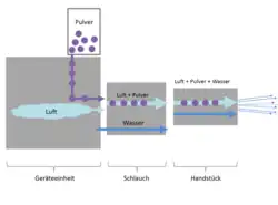 Unter kontrolliertem Druck wird ein Gemisch aus feinen Pulverpartikeln, Wasser und Luft über eine Düse auf die zu reinigende Oberfläche des natürlichen Zahnes oder Implantats gesprüht. Die Pulver-/Wasserteilchen treffen in Form eines feinen Strahls mit hoher Geschwindigkeit auf die zu reinigende Region. Anhaftende Zahnbeläge und Verfärbungen werden durch die kinetische Energie der Teilchen entfernt. Je nach Behandlungsbereich und Schweregrad der Ablagerungen kommen verschiedene Pulversorten mit unterschiedlichen Pulvereigenschaften wie Partikelgrößen und -formen zum Einsatz. Der Strahl wird zuvor erwärmt, da durch die Geschwindigkeit des Luftstroms das Gemisch sehr kalt auf dem Zahn auftrifft, was schmerzhaft sein kann.