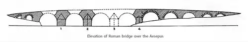 Dem italienischen Brückenforscher Galliazzo zufolge weist die charakteristische wechselweise Ziegel-Stein-Aufmauerung des Bogenwerks (siehe Foto vom Bogen am östlichen Widerlager) jedoch eher auf einen frühbyzantinischen Neubau aus der zweiten Hälfte des 5. oder ersten des 6. Jahrhunderts in der Epoche des Kaisers Justinian hin. Eindeutig römischen Ursprungs sind seiner Ansicht lediglich die Pfeilerfundamente sowie die Anrampungen mit ihren kleineren Bögen.[6]
