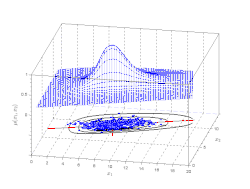 Klassenbeschreibung mittels Aizermannscher Potentialfunktion. Die Klasse liegt zu den beiden Hauptachsen gedreht im zweidimensionalen Merkmalsraum.