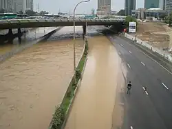 Statt der Sümpfe durchfließt der Ajalon hier kanalisiert den bis 1982 angelegten so genannten Ajalonkorridor (hebräisch פְּרוֹזְדּוֹר אַיָּלוֹן Prōsdōr Ajjalōn). Im Norden der Stadt fließt der Ajalon in den Jarkon, der wenig später in das Mittelmeer mündet.[3] Wie viele andere Flüsse in Israel trocknet der Ajalon im Sommer mangels Niederschläge weitgehend aus. Allerdings kam es im Winter zur Hauptregenzeit auch schon zu Überschwemmungen im Ajalonkrridor, die die Sperrung der Verkehrsadern dort notwendig machte.
