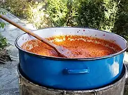 Ajvar oder Ajwar (mazedonisch und serbisch-kyrillisch Ајвар, bosnisch, slowenisch und kroatisch Ajvar, türkisch Ayvar, albanisch Ajvari, auch Hajvar oder Kavyar) ist eine Mischung aus Paprika und Auberginen in den Geschmacksrichtungen mild bis scharf und gilt als eine Spezialität der Balkanküche. Es gibt zwei Varianten: ein säuerlich-pikantes Püree aus Paprikafrüchten (80 Prozent) mit Auberginen und Peperoni sowie ein Auberginenpüree gewürzt mit Paprika, jeweils abgeschmeckt mit Knoblauch, Branntweinessig und/oder Zitrone, Salz und Zucker. Ajvar wird als Beilage zu Gegrilltem (insbesondere zu Lamm), zu Würsten, zu Gemüse, als Brotaufstrich, auch zum Verfeinern von Suppen, Eintöpfen, Saucen und als Dip verwendet. Ajvar eignet sich für die Vorratsherstellung.[1] Traditionell werden im Herbst auf dem Balkan die großen Mengen von Paprikaschoten und Auberginen für Ajvar im Freien geröstet.[2]
