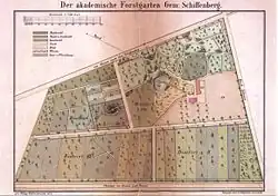 Historischer Plan des Akademischen Forstgartens Gießen in einer Lithografie von 1877.