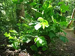 Aus dem umgefallenen und abgesägten Stamm eines Tulpenbaums mit nur noch wenig Wurzelkontakt sprießen neue Blätter.