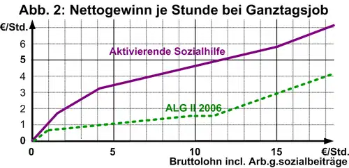 Statt des im Wesentlichen bestehenden Lohnersatzsystems sieht die aktivierende Sozialhilfe ein Lohnergänzungssystem vor. Nimmt nach Einführung des Systems ein bisher Arbeitsloser eine Beschäftigung im Niedriglohnbereich auf, so erhält er dennoch weiterhin eine staatliche Unterstützung. Diese Unterstützung sinkt zwar mit steigendem Einkommen, stellt aber in jedem Fall sicher, dass jemand, der arbeitet, deutlich besser gestellt ist als jemand, der nicht arbeitet, sofern er bedürftig ist (also nicht im Sinne des Subsidiaritätsprinzips die Möglichkeit und die Pflicht hat, auf andere Weise sein Einkommen legal aufzustocken). Insofern funktionieren die Ergänzungsleistungen wie eine negative Einkommensteuer. Gelingt es dem so Geförderten nicht, ein höheres Einkommen zu erzielen, wird die Förderleistung dem erwerbstätig Bleibenden unbefristet als Dauerleistung gewährt. Gleichzeitig werden die staatlichen Sozialleistungen für erwerbsfähige Menschen, die als nicht arbeitswillig bewertet werden, deutlich gesenkt, und zwar im Vergleich zum früher bestehenden System um 30 Prozent.
