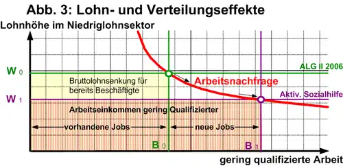 Abbildung 3 zeigt, wie durch die damit mögliche Lohnsenkung die Arbeitsnachfrage steigt und neue Jobs entstehen. Die Bruttolöhne der vorhandenen Niedriglohnarbeitsplätze sinken dabei. Die Nettoeinkommen würden wegen des Kombilohneffektes der Aktivierenden Sozialhilfe jedoch eher steigen.