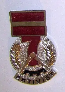 Die goldfarben gehaltene Medaille mit einem runden Mittelteil aus Aluminium, dessen Durchmesser 32 mm ist, zeigt auf ihrem Avers ein nach unten gezogenes Schriftband mit der Aufschrift: AKTIVIST. Darüber ruht das rot emaillierte Mittelfeld mit einer überdimensionalen 7, von der ein Zirkel ausgeht. Die Ziffer wird dabei links und rechts von je einer Ähre flankiert. Unter der Ziffer befindet sich ein Zahnradsegment.