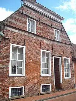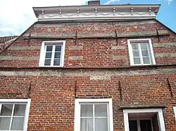 Das Krüppelwalmdach ist vermutlich durch Abbruch der ursprünglichen Giebelspitze entstanden. Auch die Gestaltung der drei großen Fenster und Tür im Erdgeschoss ist nicht authentisch.[9] Von den drei kleinen Giebelfenstern sind die beiden äußeren noch erhalten, während das mittlere heute zugemauert ist. Über jedem Fenster ist ein Rundbogen gemauert. Die Einteilung und Breite der oberen Fenster wird im Erdgeschoss ursprünglich eine Entsprechung gefunden haben, sodass im Erdgeschoss über zwei Fenster und eine Tür in gleicher Position und Breite wie im Obergeschoss auszugehen ist.[9]
