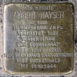 - ↑ Gedenktafel für Albert Kayser und Otto Schmirgal ( vom 5. Januar 2018 im Internet Archive) auf Gedenktafeln-in-Berlin.de