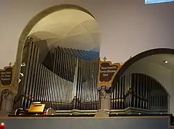 III/P | 108 | Auf vier Standorte im Kirchenraum verteilt. Die Orgel war das größte Werk und das Aushängeschild für Moser.[6] 1988/94 durch Neubauten von Mathis ersetzt. Spieltisch der Frühamtsorgel im Orgelzentrum Valley erhalten. |