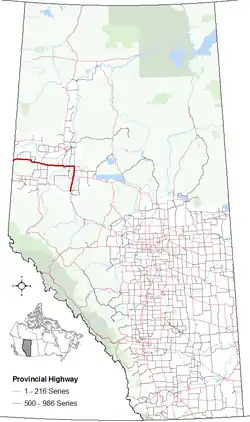 | Straßenbeginn: | Saddle Hills County (55° 46′ 42″ N, 120° 0′ 0″ W) | ||||||||||||||||||||||||||||||||||||||||||||||||||||||||||||