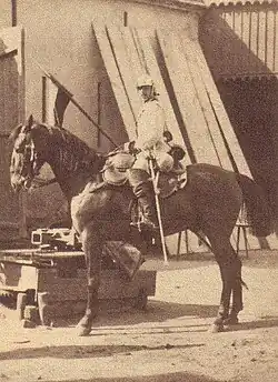 - ↑ Es handelt sich um den Ausschnitt eines Stiches von Schnaebeli & Co., Berlin mit den 120 deutschen Teilnehmern des Distanzritt-Wettbewerbs. Vorne vlnr: Premierleutnant Diestel (Dragoner-Regiment Nr. 5), Rittmeister Freiherr von Esebeck (Garde-Ulanen-Regiment Nr. 3), Hauptmann Freiherr von Müffling (1. Garde-Regiment zu Fuß), Oberstleutnant Graf von Geldern-Egmond, Premierleutnant Freiherr von Reitzenstein (Kürassier-Regiment Nr. 4), Secondeleutnant von Thaer (Kürassier-Regiment Nr. 7), Premierleutnant von Kronenfeldt (Feldartillerie-Regiment Nr. 10) Premierleutnant Edler von Planitz (Feldartillerie-Regiment Nr. 15), Rittmeister Kimmerle (4. Ch), Secondeleutnant von Massow (Kürassier-Regiment Nr. 4), Rittmeister von Poser Dragoner-Regiment Nr. 26