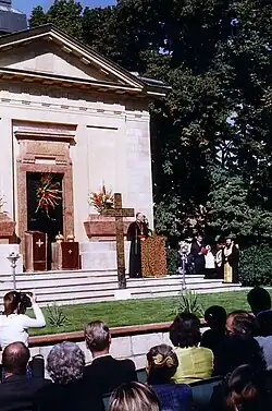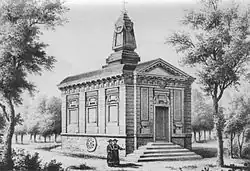 Alexandra Pawlownas Leichnam wurde vorerst vorübergehend in der Kapuzinerkirche der ‚Wasserstadt’ von Ofen beigesetzt. Dem testamentarischen Vermächtnis der Großfürstin zufolge, die auf ihrem Lieblingsgut auf Üröm[6] bestattet werde wollte, erteilte Palatin Joseph den Auftrag hier für sie eine orthodoxe Kapelle zu errichten. Mit der Planung wurde der Hofarchitekt des Palatins Stanislaus Heppe (*? – †1809) beauftragt.[7] Der Grundstein wurde im Jahre 1802 gelegt. Die Einweihung der Grabkapelle nahm Alexandra Pawlownas Beichtvater – den sie aus St. Petersburg mitgebracht hatte – Dechant Andrej Samborski im Jahre 1803 vor.