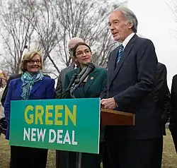 Sie gehört zu den Unterstützerinnen des Green New Deal, einer Initiative mit dem Ziel eines ökologischen Umbaus der Industriegesellschaft, und machte dies zu einem Schwerpunkt ihrer Wahlkampagne.[30] Sie begleitete 2018 die Initiative Sunrise Movement, die sich ebenso für den Green New Deal einsetzt, bei der Besetzung des Büros von Nancy Pelosi.[31]